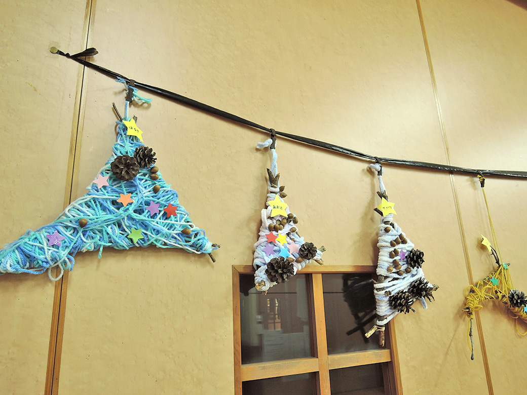 年中さんは、三角形に木の枝を組み合わせ、 好きな毛糸をぐるぐるまいて木の実を飾りました。 (暗くなってから写真を撮ったので色がわかりにくいですが、 色とりどりの毛糸でとってもかわいいです。)