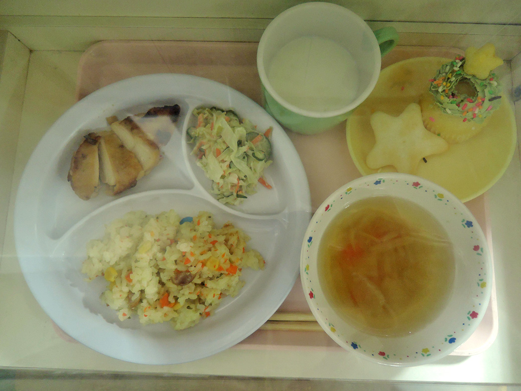 こちらはクリスマス祝会の日のお給食です。 ◎お昼のメニュー ・ピラフ ・チキンの照り焼き ・コールスローサラダ ・オニオンスープ ◎午後のおやつ ・クリスマスリースケーキ おやつは柔らかいスポンジケーキの上に クリームとチョコでリースを作り、 お星さまの形の焼き菓子を添えています。 (大きいお星さまは実はおせんべいですが、 甘いとしょっぱいで絶妙なおいしさです) 祝会があって、サンタさんが来てプレゼントをもらって、 お祝いのお給食もいただいて、今年も楽しい一日でした(^^♪